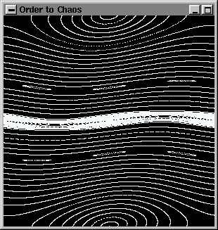 Dies ist schon genug Material, um unsere ersten beiden Beispiele zu schreiben. Das erste Beispiel ist ein einfaches OpenGL Programm, das eine Reihe von Kreise in eine chaotische Abbildung (Standard-Abbildung) schreibt. Wenn der Leser nicht mit Abbildungen - insbesondere der Standard-Abbildung - umgehen kann, ist das nicht schlimm. Einfach gesagt handelt es sich um rekursive Zuordungen, bei denen der nächste Punkt aus dem vorigen Punkt berechnet wird.