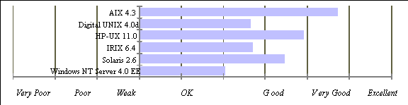 Lorsqu'on en vient à des fonctionnalités réseau un peu plus sophistiquées, il semble que les environnements UNIX commerciaux tiennent la dragée haute au NT Server 4.0 Enterprise Edition de Microsoft. Bien que ce ne soit pas essentiel pour les performances réseau, l'architecture 64 bits est bien implantée dans les environnements UNIX (à l'opposé de NT qui est un sytème 32 bits). D.H. Brown Associates Inc. font le rapport suivant des résultats de leurs analyses: (le paragraphe ci-dessous ainsi que les tableaux et les trois graphes sont extraits de leur page web dans le site de Digital Equipment Corporation, elle s'intitule