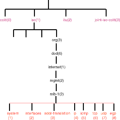 Figure 1 shows the TCP/IP MIB name space is located just down the mgmt name space of the IAB. The hierarchy also specifies a number for each of the levels.