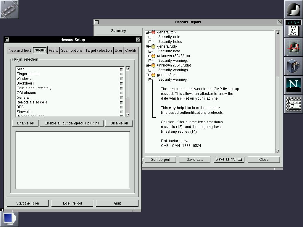 Nessus her ne kadar nmapden daha karışık olsa da onu hala kullanmak kolaydır ve birçok özelliğe sahiptir.Mesela raporlar hazırlayabilir ve raporlar arasında farklar yapabilir...Başka bir özellik daha ilginçtir;nessus porttarayıcıda bulunan problemlere çözümler önerir.Makinalar Unix makinaları olduğundan öneriler genelde iyi önerilerdir.Başka işletim sistemleri için daha az uygun olacaklardır.Fakat önemli bir nokta değildir.