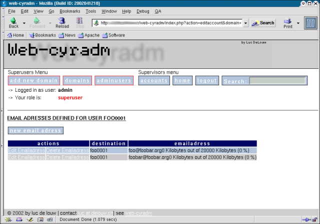 Web-cyradm is the webinterface that allows you to perform the administrative tasks required to maintain the mail system. This screenshot shows the domain administration part of Web-cyradm.