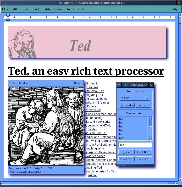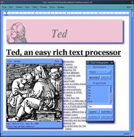 Ted, een wysiwyg-tekstverwerker (What You See Is What You Get) ontwikkeld door Mark de Does M.de.Does@inter.nl.net is niet alleen maar een simpele teksteditor. Het uiterlijk mag dan nogal basaal aandoen: een Mosaic-interface, geen pictogrammen, een paar lettertypen... maar je ziet direct dat je hier met een stuk gereedschap te maken hebt, een tool waarmee je dagelijkse werkzaamheden kunt verrichten.