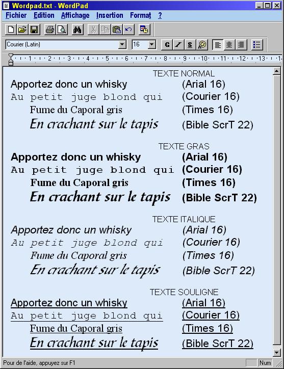 Alle teksteigenschappen (behalve de puntgrootte van het lettertype Courier) en de opmaak