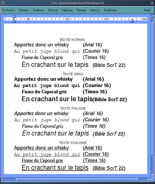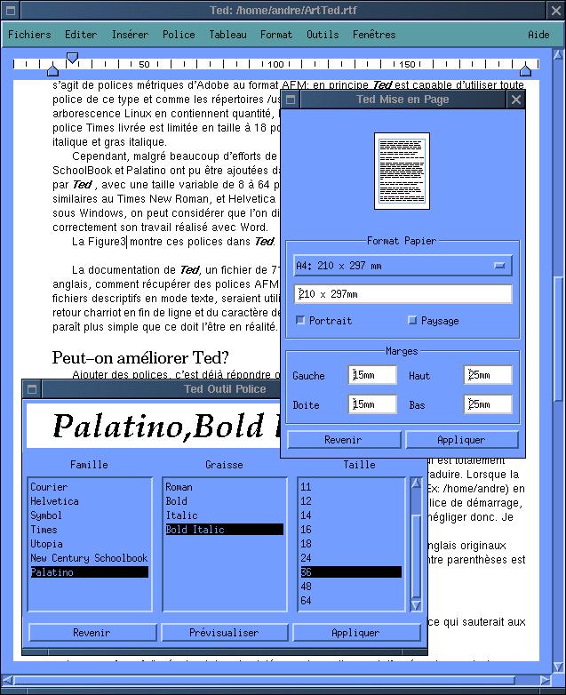 Helaas ben ik er ondanks herhaalde pogingen alleen in geslaagd de lettertypen Utopia, New Century SchoolBook en Palatino in /usr/local/afm te importeren. Ik heb ze zonder problemen in Ted gebruikt in puntgrootten variërend van 8 tot 64. Natuurlijk zijn dit maar een paar lettertypen maar het zijn wel juist drie lettertypen die een grote overeenkomst vertonen met Times New Roman. Voeg daaraan toe het feit dat Helvetica grote overeenkomst vertoont met Arial (samen zijn dit de meest gebruikte letterypen onder Windows) en we hebben precies de belangrijkste lettertypen die nodig zijn om te werken met een document dat onder Windows is gemaakt.